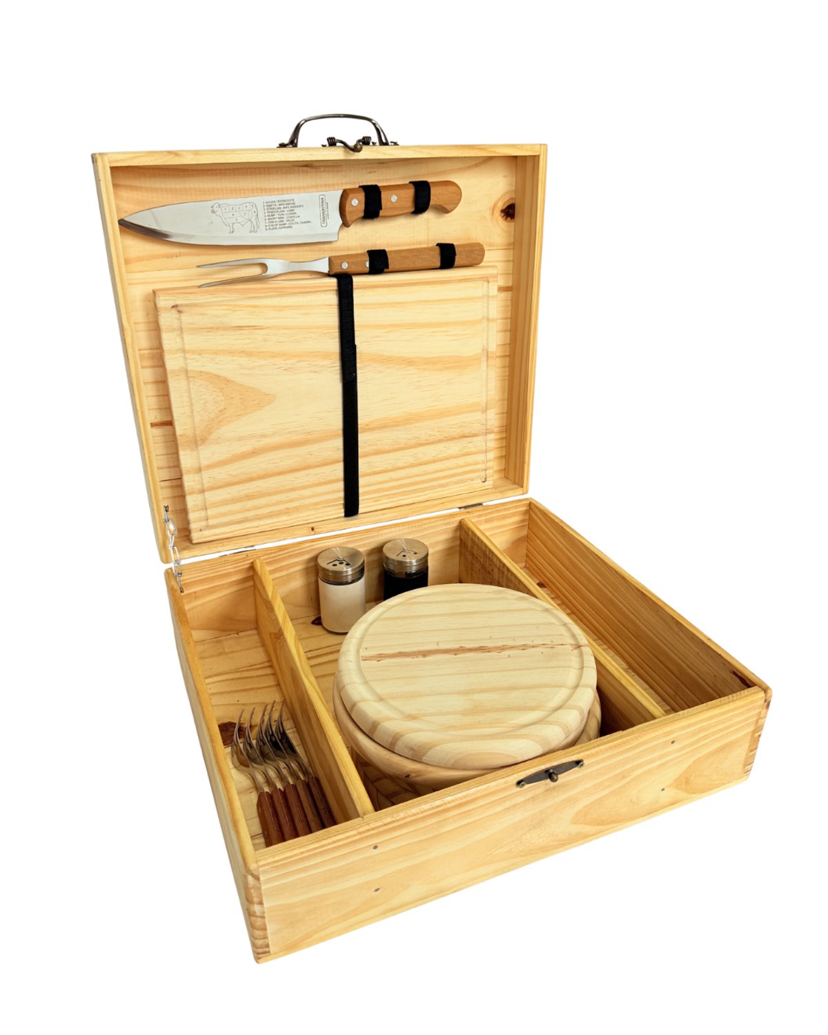 KIT DE ASADO PARA DOS COMENSALESEl kit incluye:2 Platos de madera2 Pares de cubiertosPar de cubiertos largosTabla para picar carneCofre de maderaPersonalizado gratis
